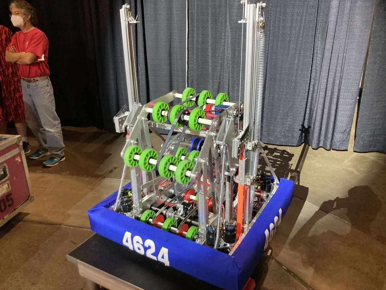 Our robot can currently climb to traversal rung and shoot and intake two cargo at a time. It shoots with 85% accuracy and can climb to traversal rung in 25 seconds. We use a swerve drive train.